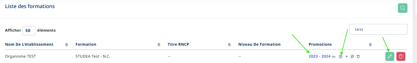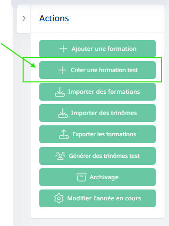 Dans les boutons d'action de droite on trouve " Créer une formation test", ce bouton est une bonne pratique et permet de générer une formation avec une promotion TEST dans un établissement TEST, avec un trinôme TEST que vous pouvez renommer comme modèle afin d'effectuer des paramétrages et des questionnaires qui pourront par la suite être dupliqués sur d'autres promotions.