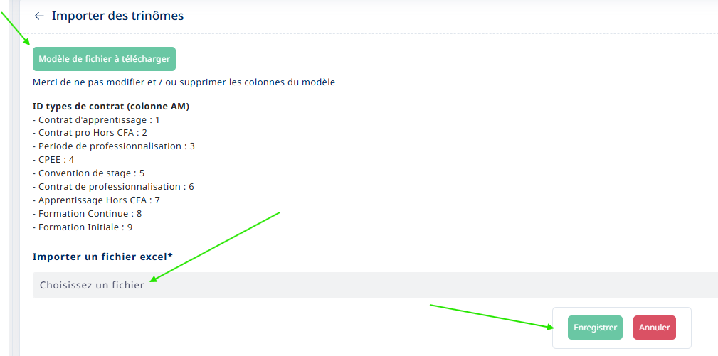 Ensuite dans importer les trinômes, télécharger le modèle de fichier, ne pas changer l ordre des colonnes