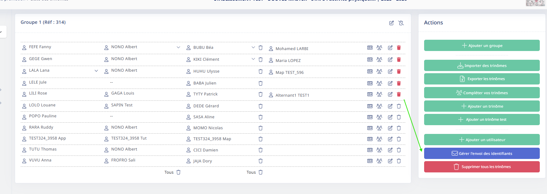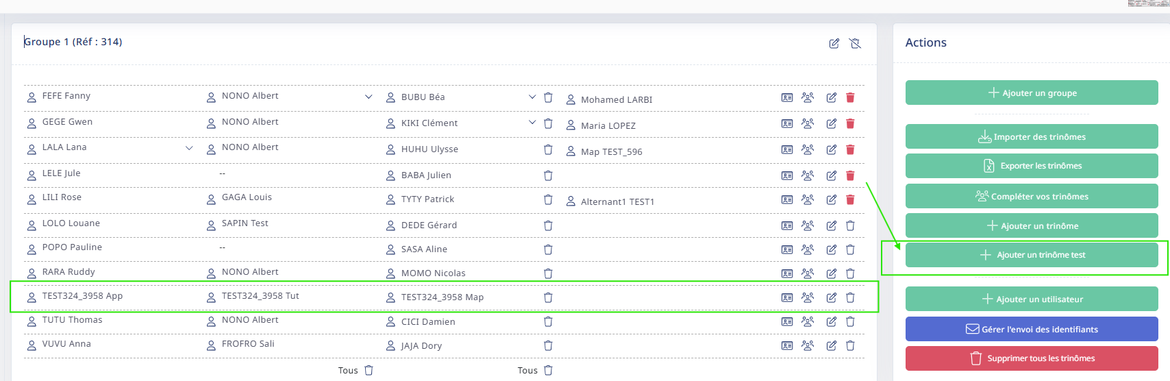 - Il est conseillé d'ajouter un ou plusieurs trinômes TESTS sur toutes vos promotions, vous pouvez ainsi incarner les utilisateurs de ce trinômes test : afin d'effectuer des vérifications sur vos paramétrages des divers modules.