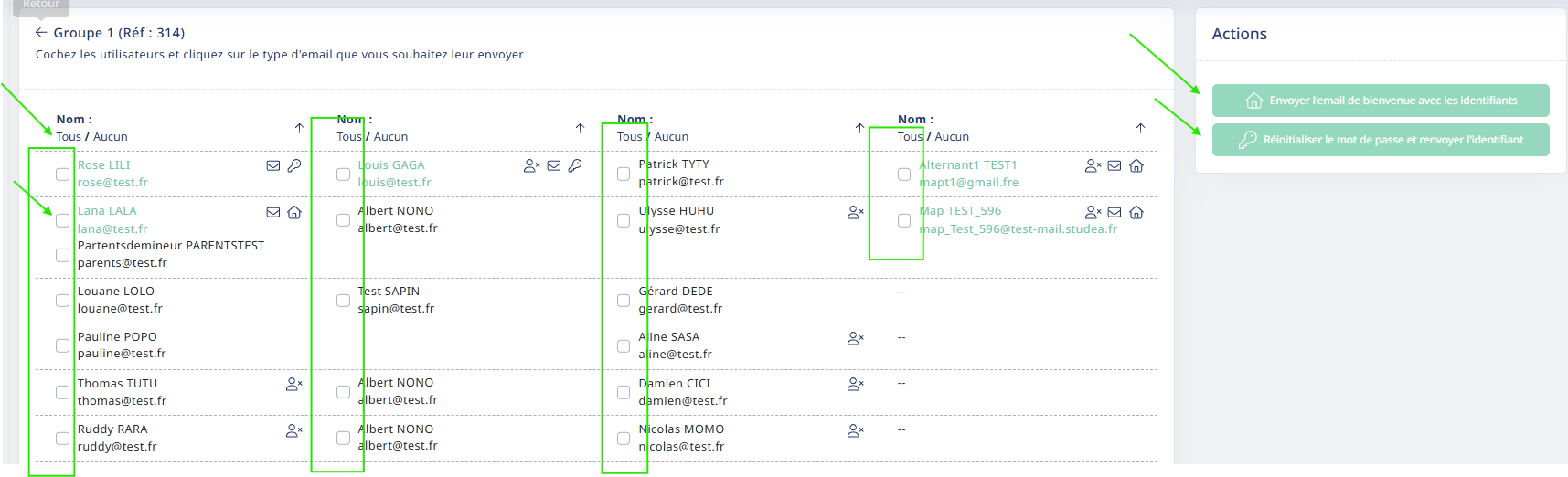 Sous forme de case à cocher comme ici : en sélectionnant tous les utilisateurs ou seulement certains puis avec les boutons actions à droite soit envoyer le mail de bienvenue ou réinitialisation du mot de passe.